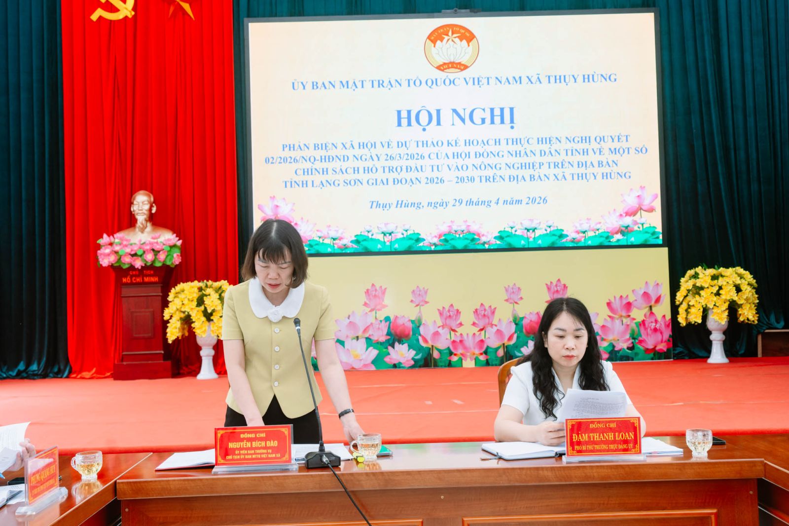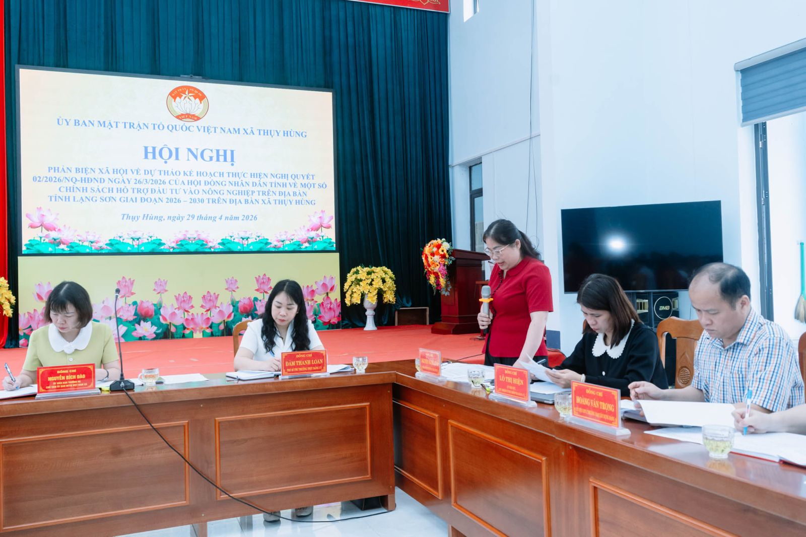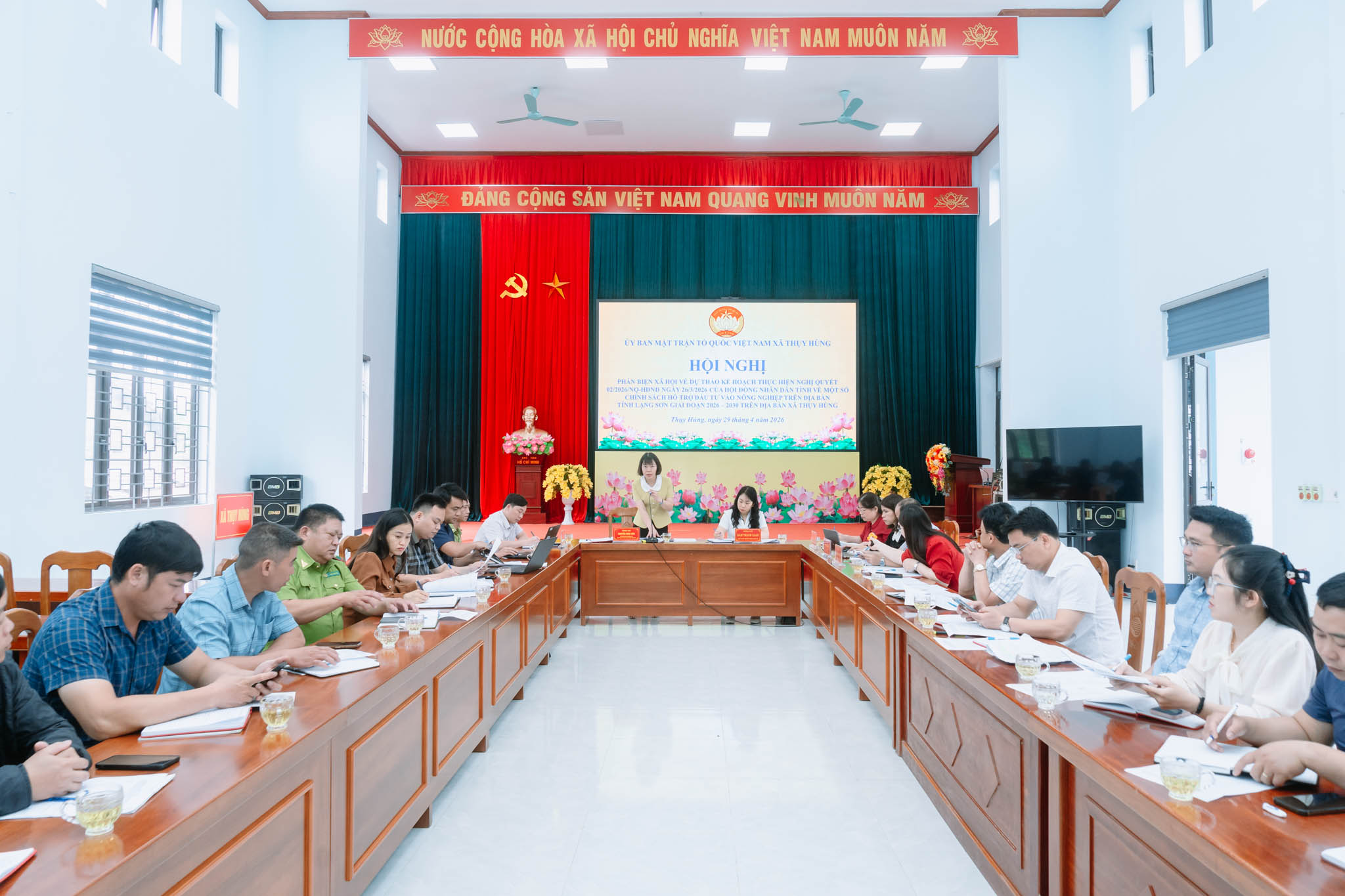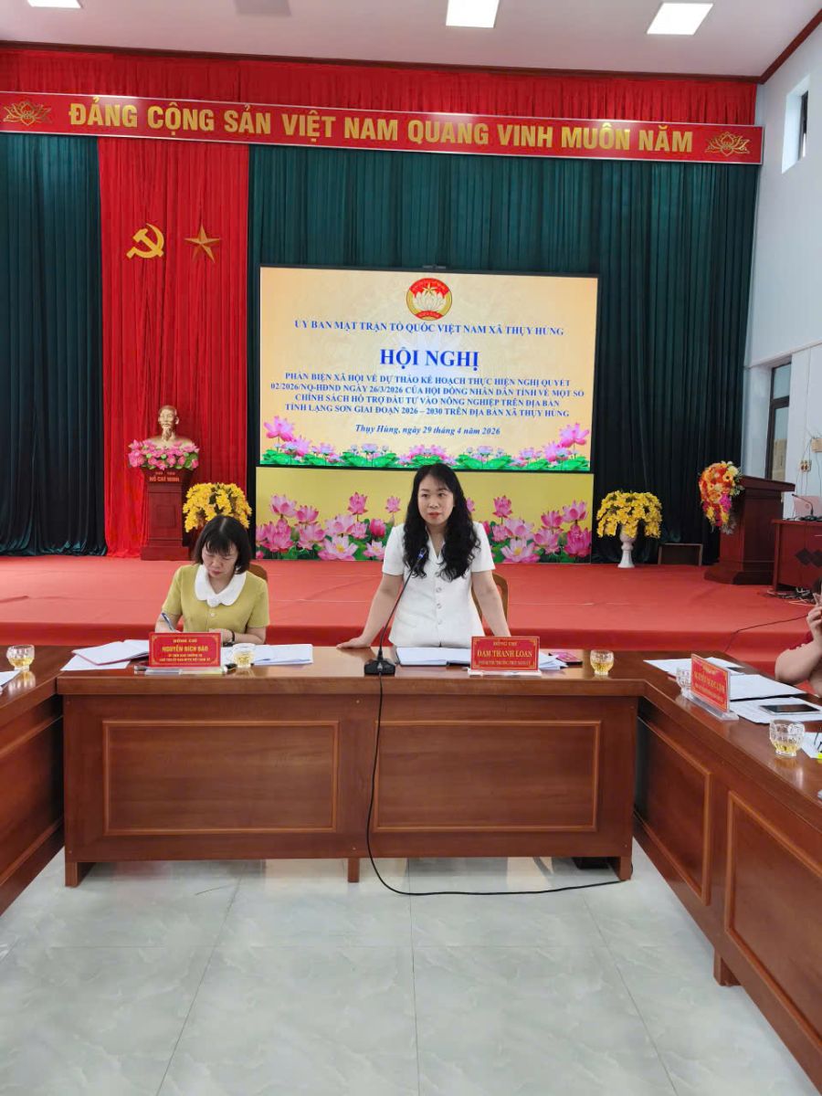 Sáng ngày 29 tháng 4, Ủy ban Mặt trận Tổ quốc Việt Nam xã Thụy Hùng đã tổ chức Hội nghị phản biện xã hội đối với dự thảo kế hoạch thực hiện Nghị quyết số 02 của Hội đồng nhân dân tỉnh về một số chính sách hỗ trợ đầu tư nông nghiệp trên địa bàn tỉnh Lạng Sơn, giai đoạn 2026–2030. Dự hội nghị có đồng chí Đàm Thanh Loan – Phó Bí thư Thường trực Đảng ủy xã, cùng các đồng chí nguyên lãnh đạo xã, đại diện các ban, ngành, đoàn thể và các thành phần tham gia góp ý.