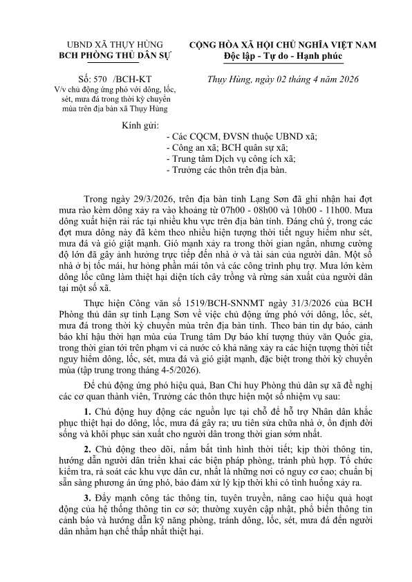 CHỦ ĐỘNG ỨNG PHÓ VỚI DÔNG, LỐC, SÉT, MƯA ĐÁ TRONG THỜI KỲ CHUYỂN MÙA TRÊN ĐỊA BÀN XÃ THỤY HÙNG