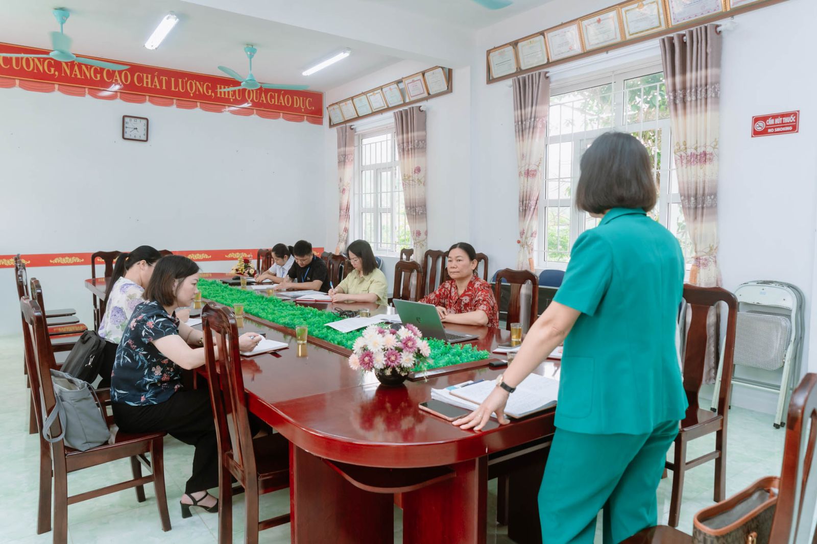 Tại đơn vị trường, đoàn công tác đã tập trung kiểm tra toàn diện việc triển khai nhiệm vụ năm học, trong đó chú trọng công tác chỉ đạo điều hành của nhà trường; việc thực hiện nền nếp, kỷ luật, kỷ cương hành chính; công tác cải cách hành chính gắn với chuyển đổi số trong giáo dục. Đồng thời, đoàn cũng đánh giá việc đảm bảo an ninh, an toàn trường học; công tác vệ sinh an toàn thực phẩm, đặc biệt tại các bếp ăn bán trú; công tác thi đua, khen thưởng và truyền thông giáo dục. Bên cạnh đó, nội dung kiểm tra còn tập trung vào việc quản lý, sử dụng cơ sở vật chất, trang thiết bị dạy học theo hướng hiệu quả, tránh lãng phí; việc triển khai thực hiện Nghị quyết số 57-NQ/TW; công tác thu, chi theo quy định; việc thực hiện đầy đủ, kịp thời các chế độ, chính sách đối với cán bộ, giáo viên, nhân viên và học sinh. Công tác phân công nhiệm vụ, thực hiện định mức lao động, quản lý hồ sơ viên chức và hoạt động kiểm tra nội bộ trong các cơ sở giáo dục cũng được đoàn quan tâm đánh giá.