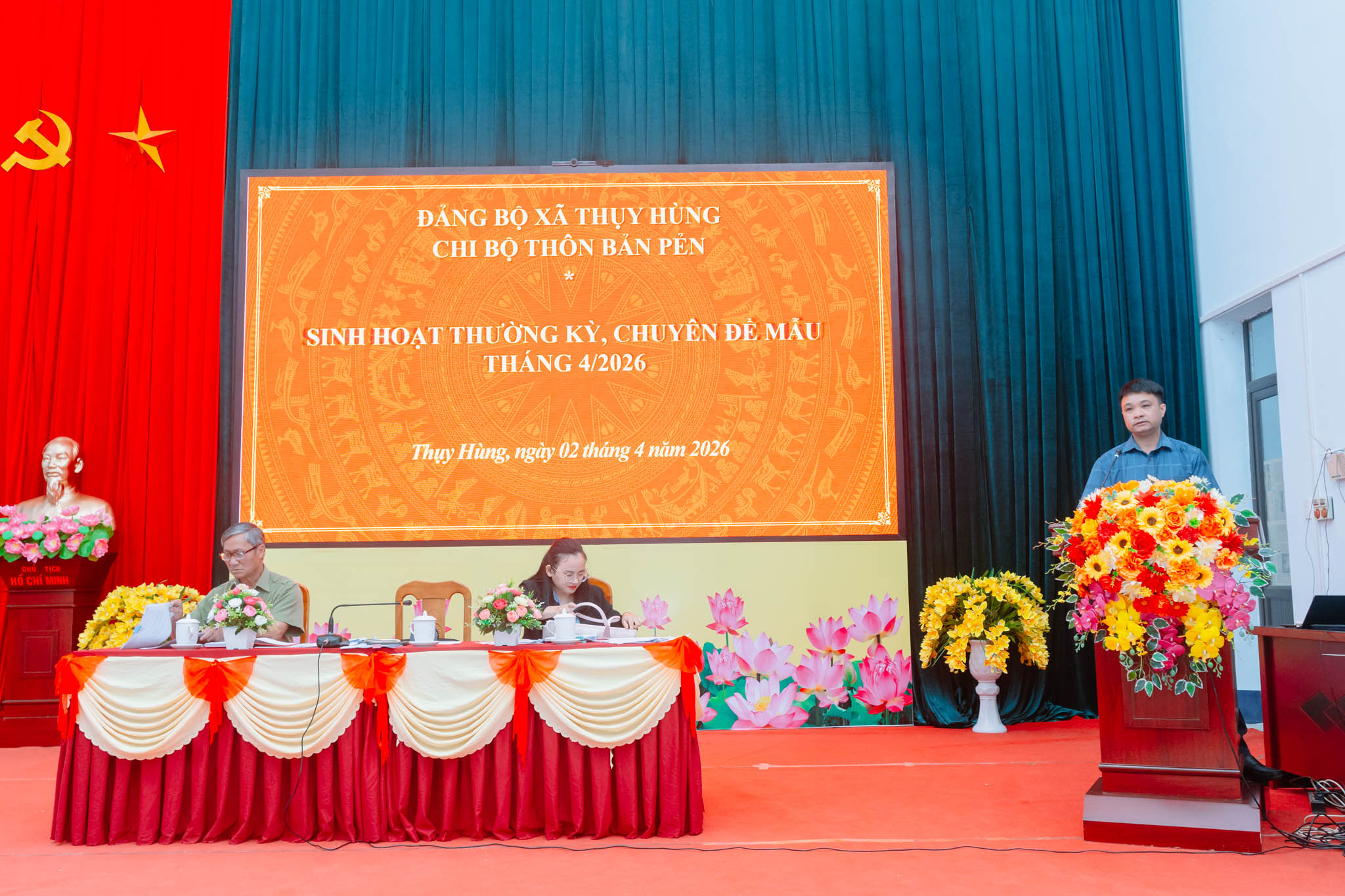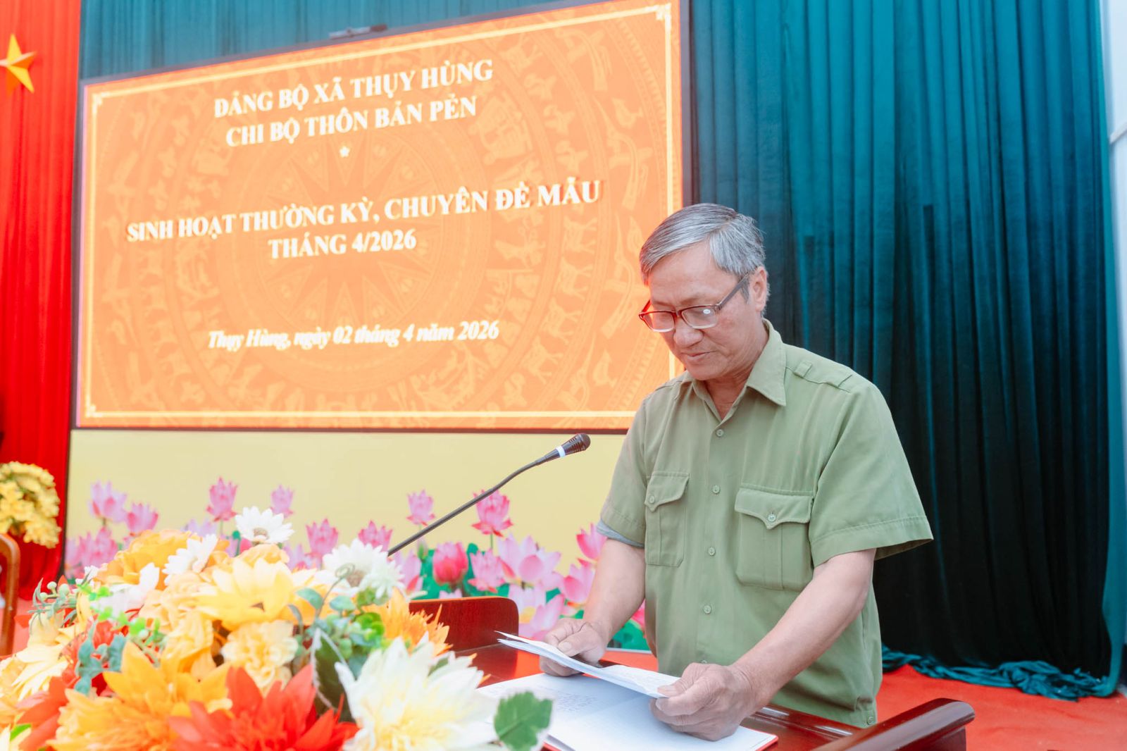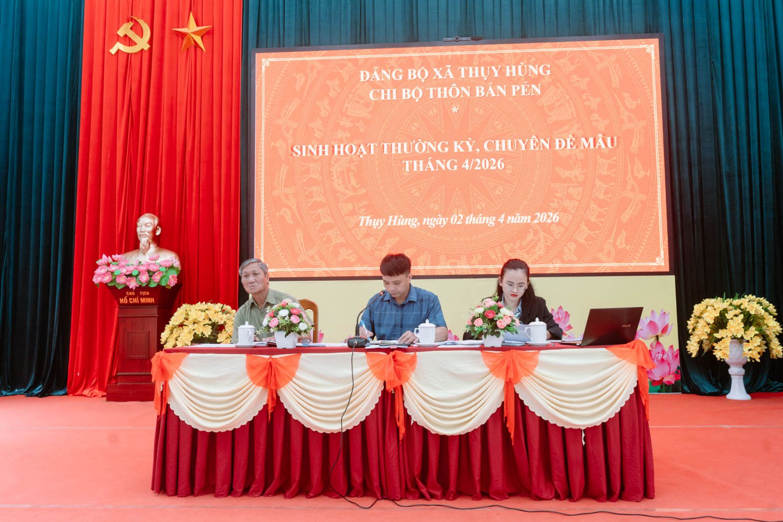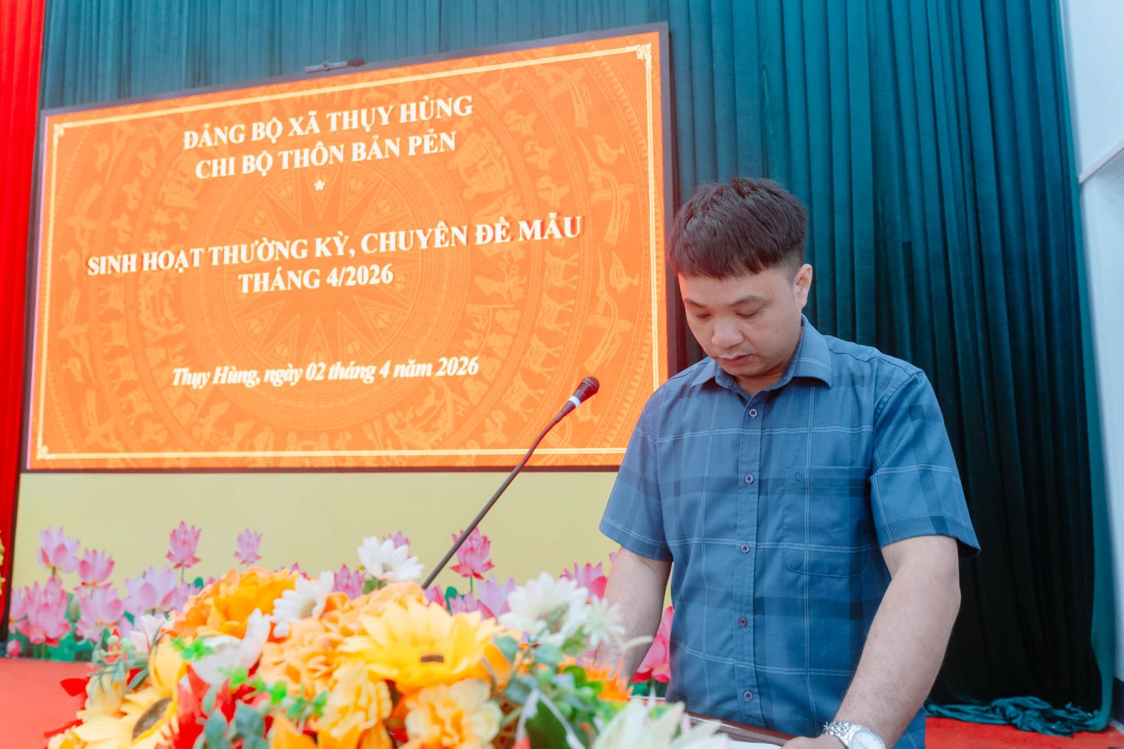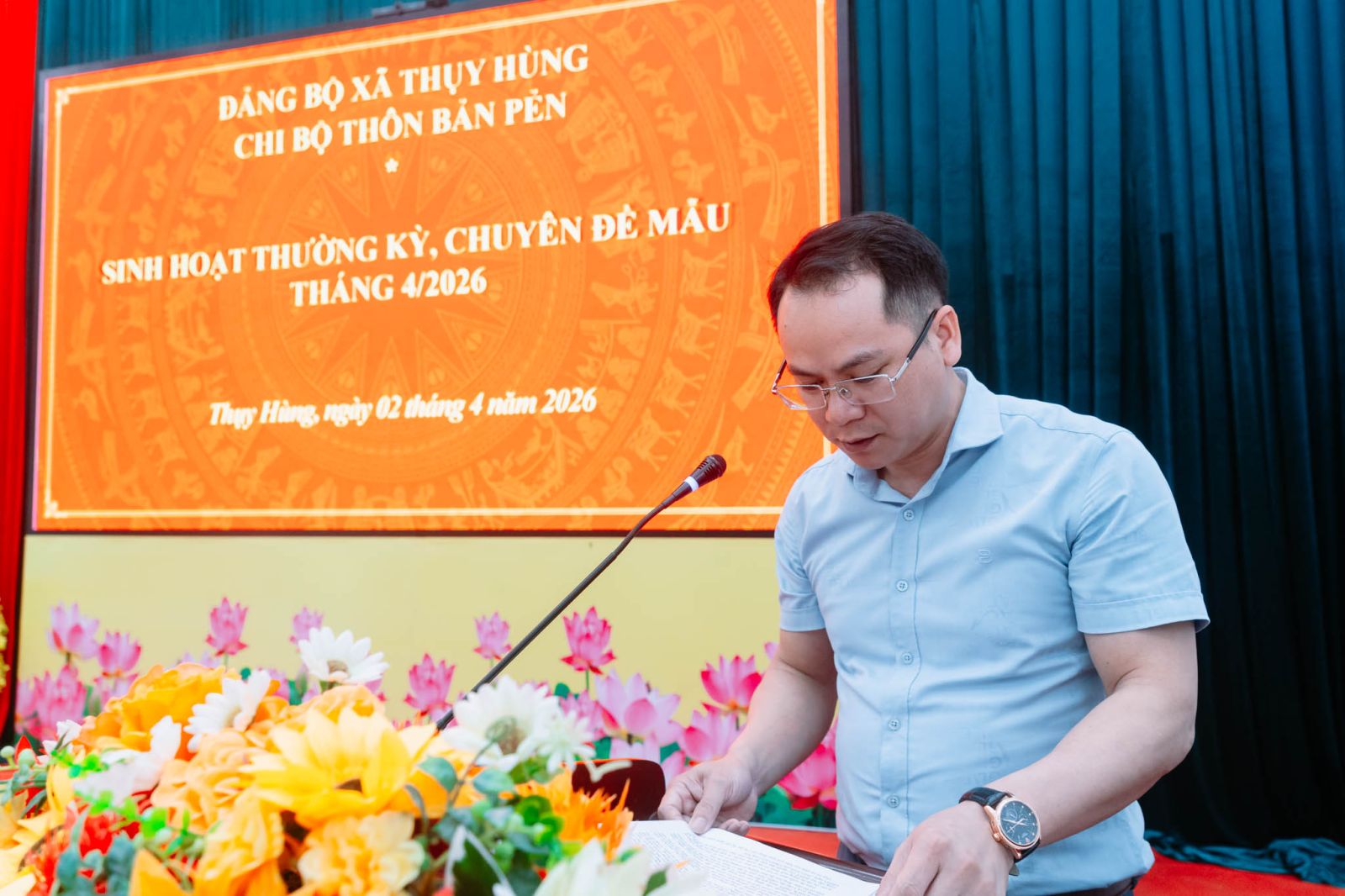 Sáng ngày 2/4, Đảng bộ xã Thụy Hùng đã tổ chức sinh hoạt chi bộ mẫu thường kỳ gắn với sinh hoạt chuyên đề năm 2026. Dự buổi sinh hoạt có các đồng chí trong Thường trực Đảng ủy, cùng Bí thư, Phó Bí thư các chi bộ trực thuộc. Chi bộ thôn Bản Pẻn được lựa chọn tổ chức sinh hoạt điểm để các chi bộ trong toàn Đảng bộ cùng dự, theo dõi và rút kinh nghiệm.