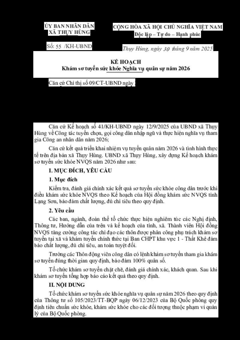 | Tiêu đề văn bản | Kế hoạch Khám sơ tuyển sức khỏe Nghĩa vụ quân sự năm 2026 | ||