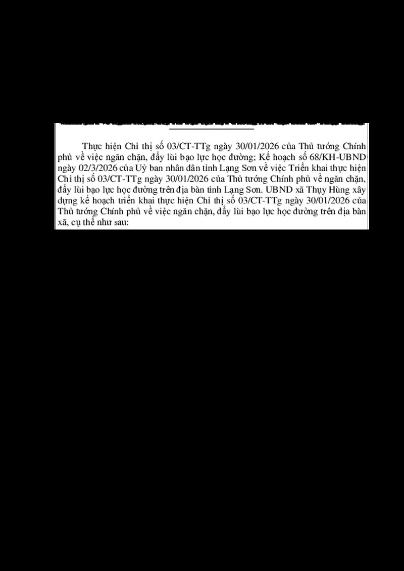 | Tiêu đề văn bản | Kế hoạch triển khai thực hiện Chỉ thị số 03/CT-TTg ngày 30/01/2026 của Thủ tướng chính phủ về ngăn chặn, đẩy lùi bạo lực học đường trên địa bàn xã Thụy Hùng | ||