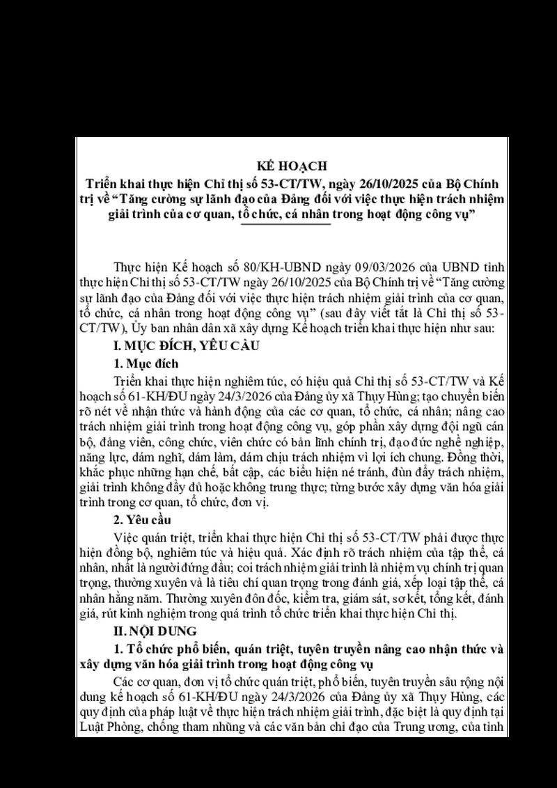 | Tiêu đề văn bản | Kế hoạch triển khai thực hiện Chỉ thị số 53-CT/TW, ngày 26/10/2025 của Bộ Chính trị về "Tăng cường sự lãnh đạo của Đảng đối với việc thực hiện trách nhiệm giải trình của cơ quan, tổ chức, cá nhân trong hoạt động công vụ" | ||