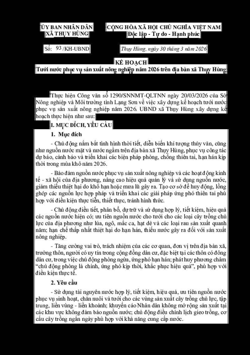 Kế hoạch Tưới nước phục vụ sản xuất nông nghiệp năm 2026 trên địa bàn xã thụy hùng