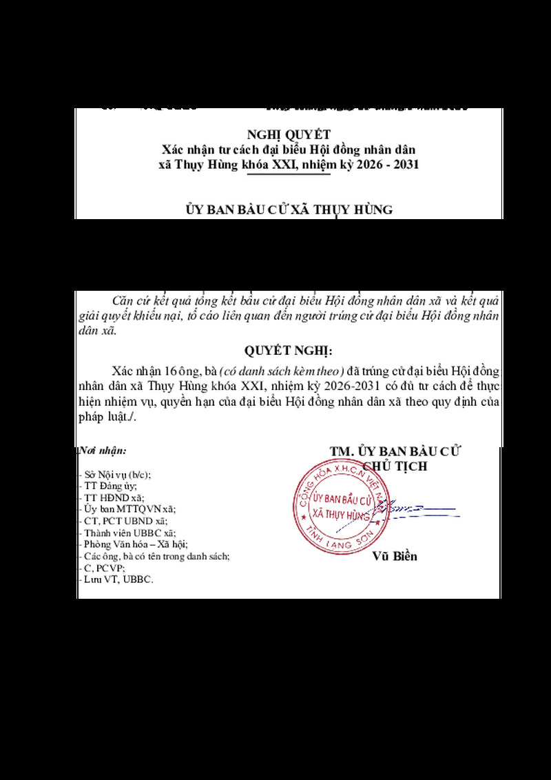Nghị quyết xác nhận tư cách đại biểu Hội đồng nhân dân xã Thụy Hùng khóa XXI, nhiệm kỳ 2026 - 2031