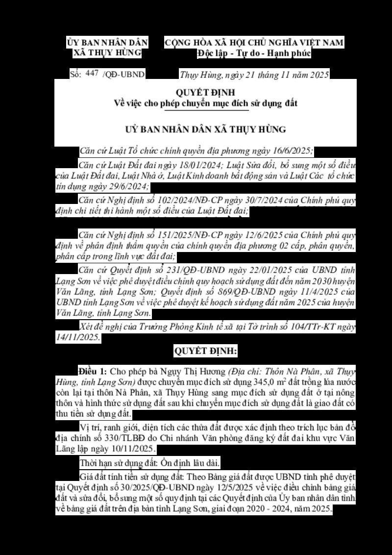| Tiêu đề văn bản | Quyết định Về việc cho phép chuyển mục đích sử dụng đất từ đất Trồng lúa nước còn lại sang đất ở tại nông thôn | ||
