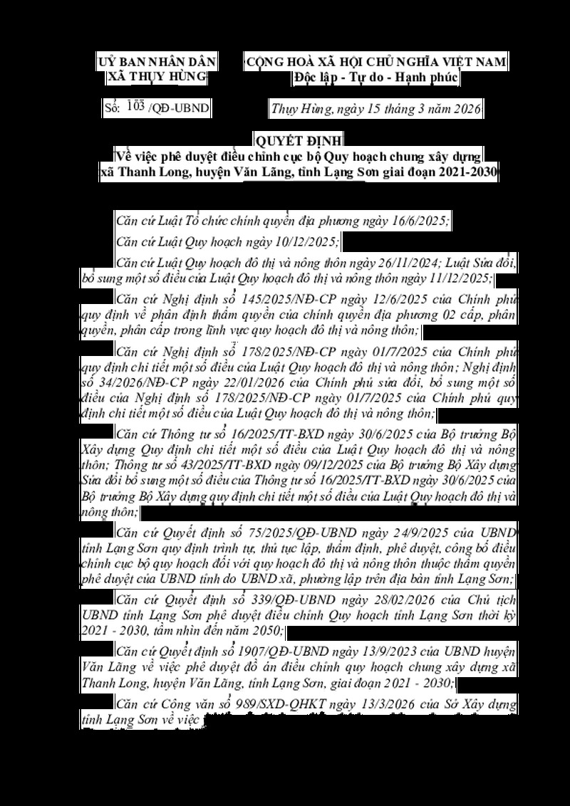 | Tiêu đề văn bản | Quyết định Về việc phê duyệt Điều chỉnh cục bộ Quy hoạch chung xây dựng xã Thanh Long, huyện Văn Lãng, tỉnh Lạng Sơn giai đoạn 2021-2030 | ||