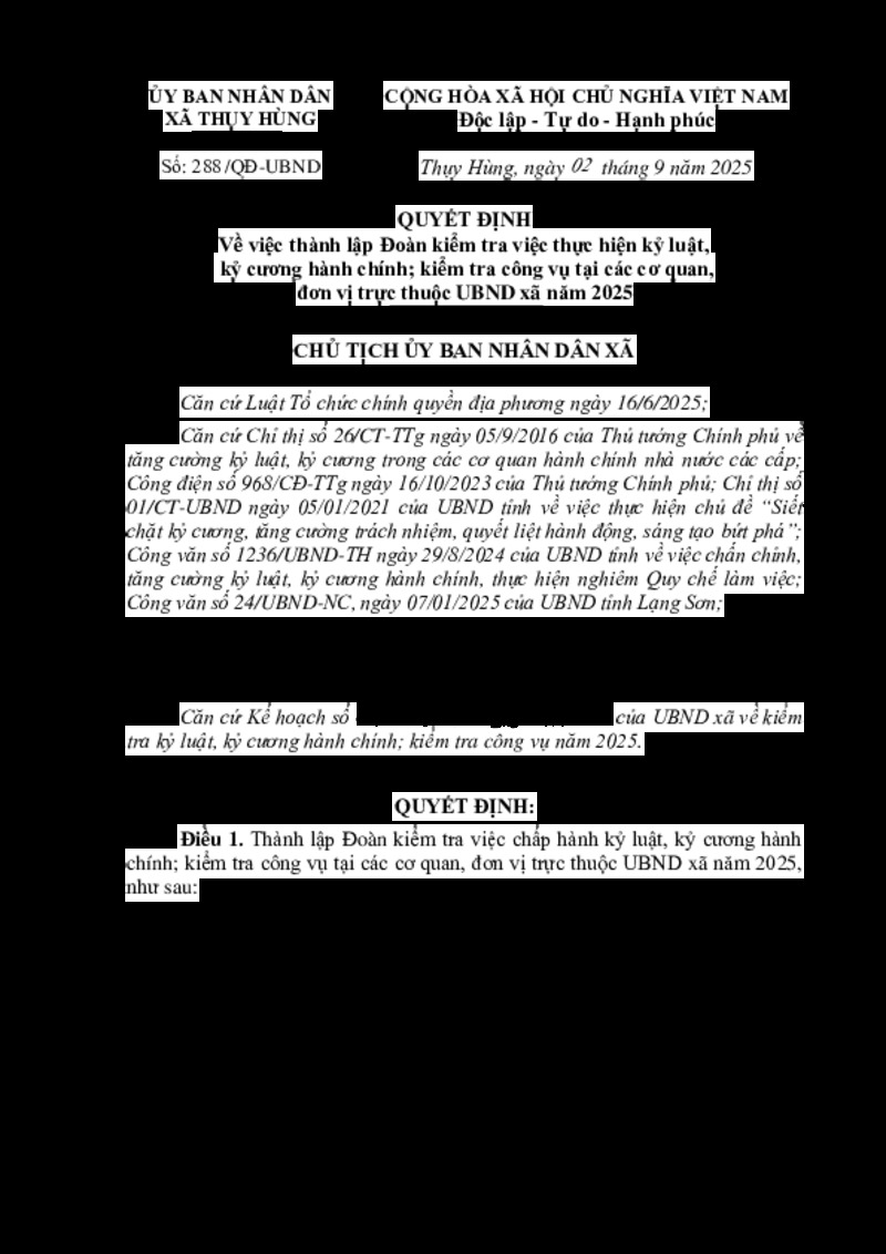 | Tiêu đề văn bản | QUYẾT ĐỊNH Về việc thành lập Đoàn kiểm tra việc thực hiện kỷ luật, kỷ cương hành chính; kiểm tra công vụ tại các cơ quan, đơn vị trực thuộc UBND xã năm 2025 | ||