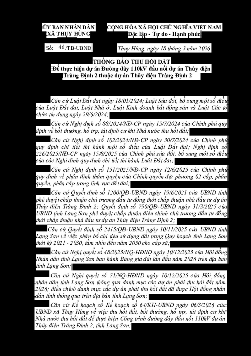 | Tiêu đề văn bản | Thông báo thu hồi đất hộ bà Nông Thị Hường thôn Bản Cháu, xã Thuỵ Hùng, tỉnh Lạng Sơn | ||