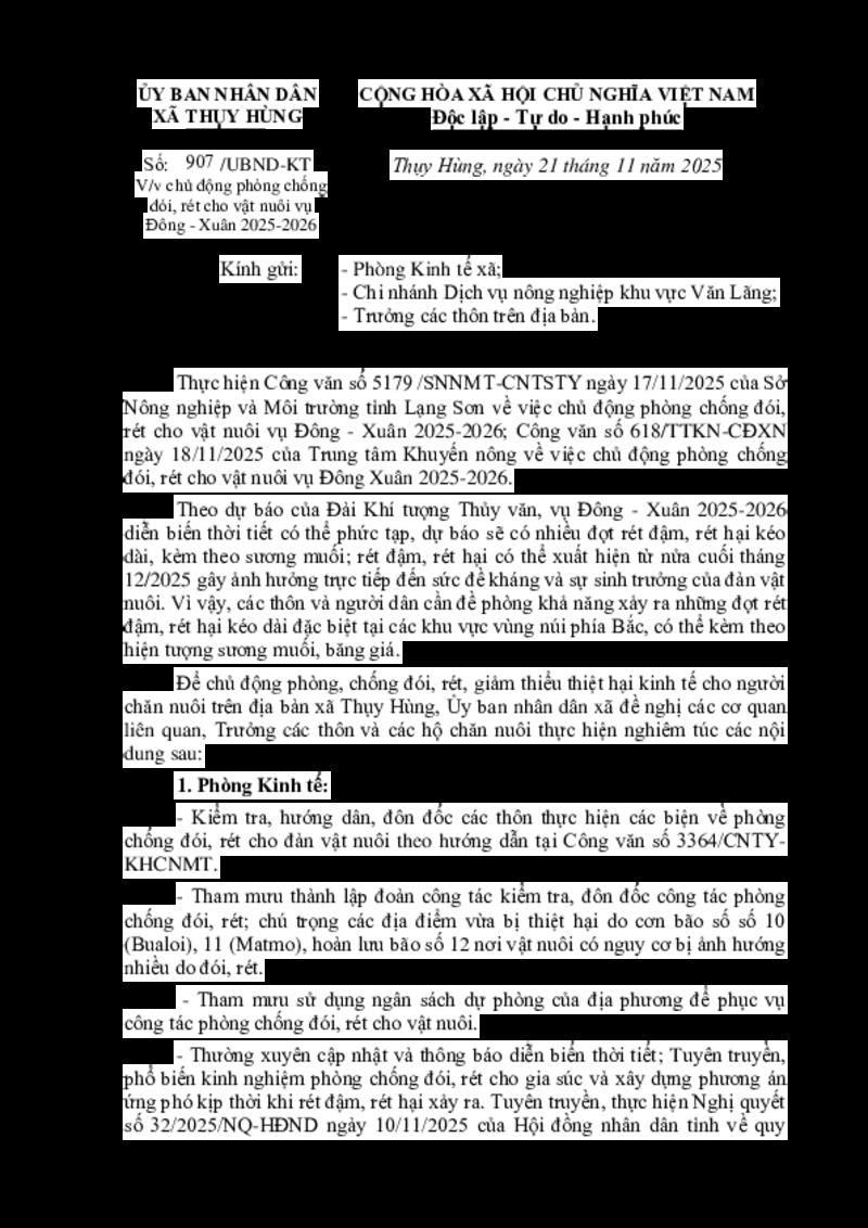 | Tiêu đề văn bản | V/v chủ động phòng chống đói, rét cho vật nuôi vụ Đông - Xuân 2025-2026 | ||