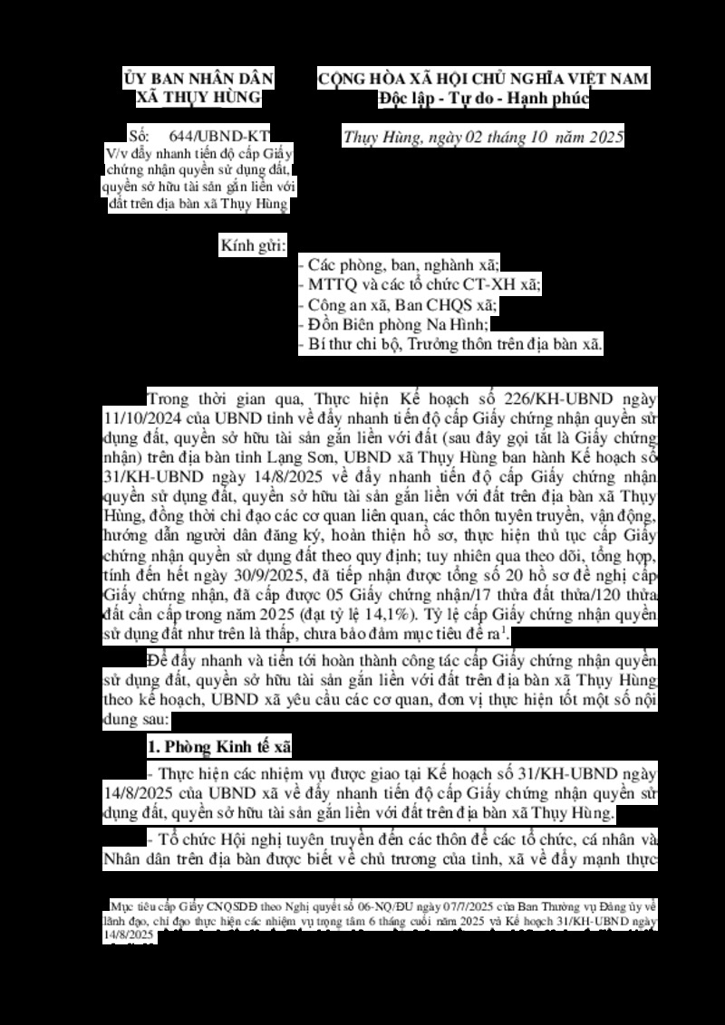 | Tiêu đề văn bản | V/v đẩy nhanh tiến độ cấp Giấy chứng nhận quyền sử dụng đất, quyền sở hữu tài sản gắn liền với đất trên địa bàn xã Thụy Hùng | ||