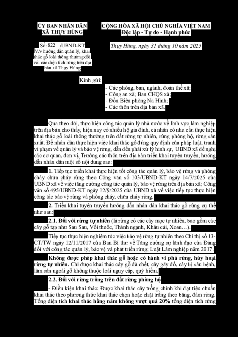 | Tiêu đề văn bản | V/v hướng dẫn quản lý, khai thác gỗ loài thông thường đối với các diện tích rừng trên địa bàn xã Thụy Hùng | ||