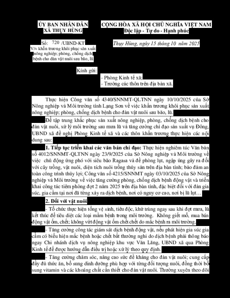 | Tiêu đề văn bản | V/v khẩn trương khôi phục sản xuất nông nghiệp; phòng, chống dịch bệnh cho đàn vật nuôi sau bão, lũ | ||