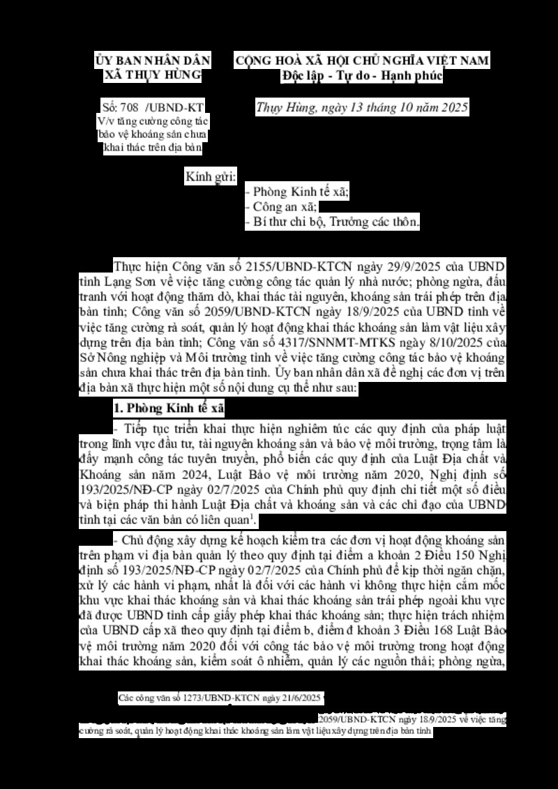 | Tiêu đề văn bản | V/v tăng cường công tác bảo vệ khoáng sản chưa khai thác trên địa bàn | ||