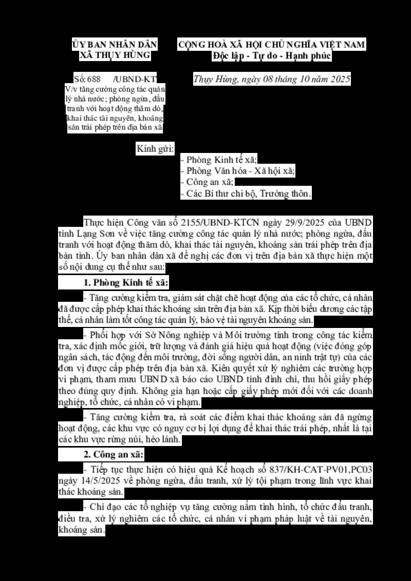 | Tiêu đề văn bản | V/v tăng cường công tác quản lý nhà nước; phòng ngừa, đấu tranh với hoạt động thăm dò, khai thác tài nguyên, khoáng sản trái phép trên địa bàn xã | ||