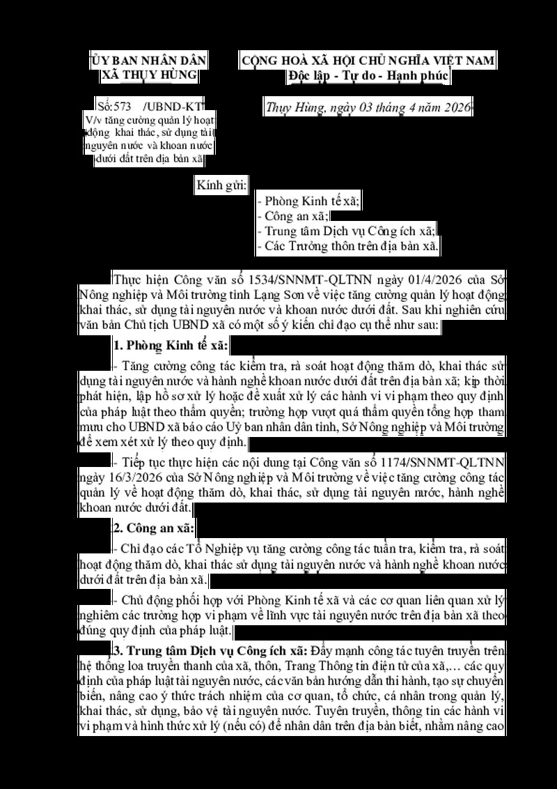 | Tiêu đề văn bản | V/v tăng cường quản lý hoạt động khai thác, sử dụng tài nguyên nước và khoan nước dưới đất | ||