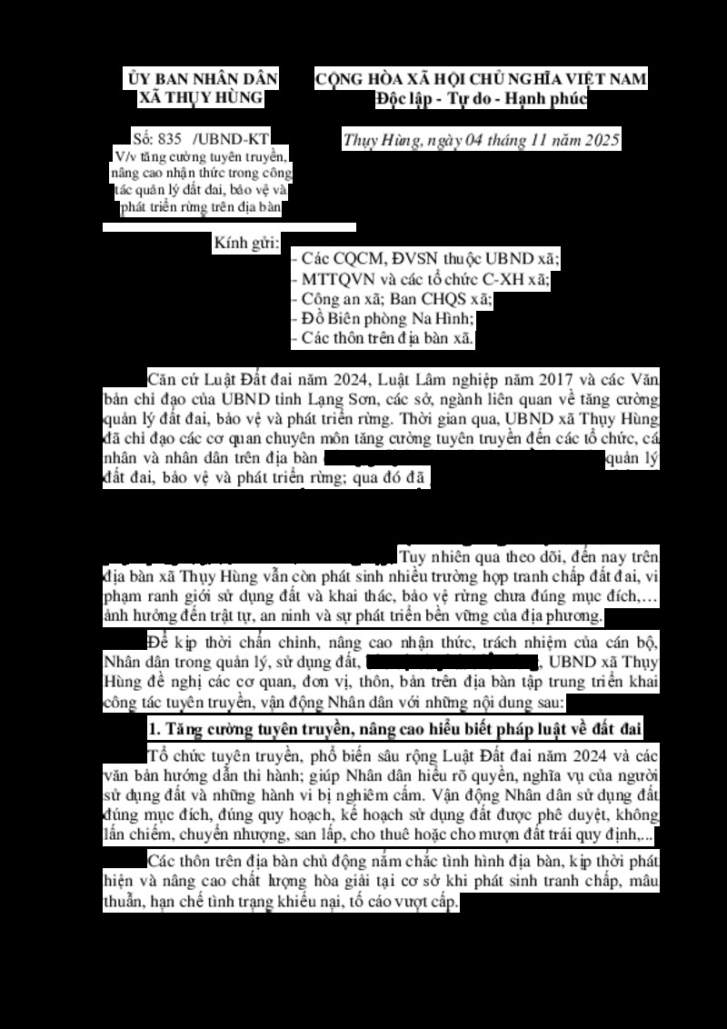 | Tiêu đề văn bản | V/v tăng cường tuyên truyền, nâng cao nhận thức trong quản lý đất đai, bảo vệ và phát triển rừng | ||
