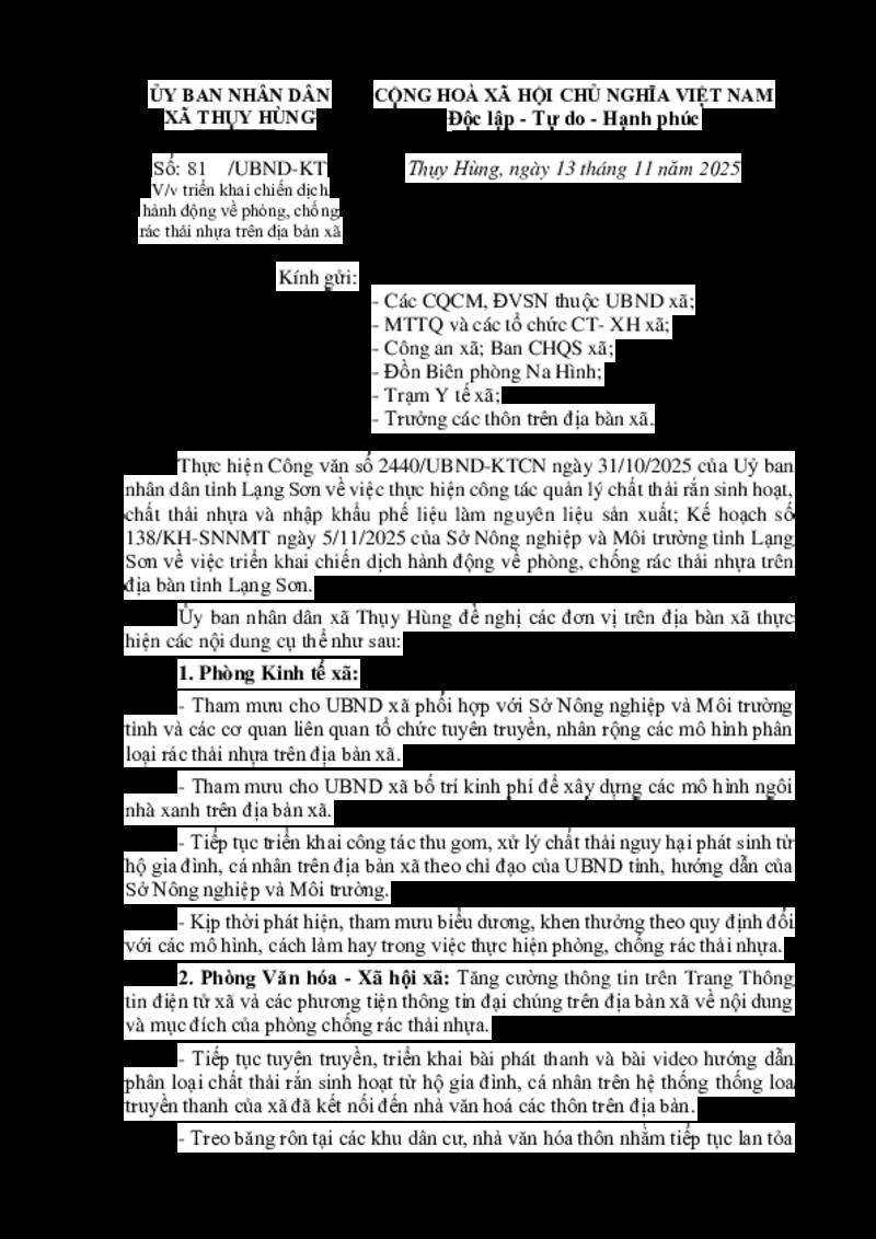 | Tiêu đề văn bản | V/v triển khai chiến dịch hành động về phòng, chống rác thải nhựa trên địa bàn xã | ||