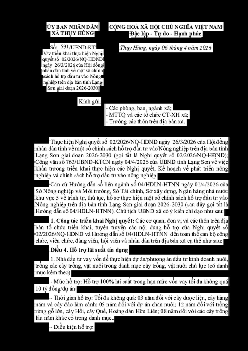 | Tiêu đề văn bản | VV triển khai thực hiện Nghị quyết số 02/2026/NQ-HĐND ngày 26/3/2026 của Hội đồng nhân dân tỉnh về một số chính sách hỗ trợ đầu tư vào Nông nghiệp trên địa bàn tỉnh Lạng Sơn giai đoạn 2026-2030 | ||