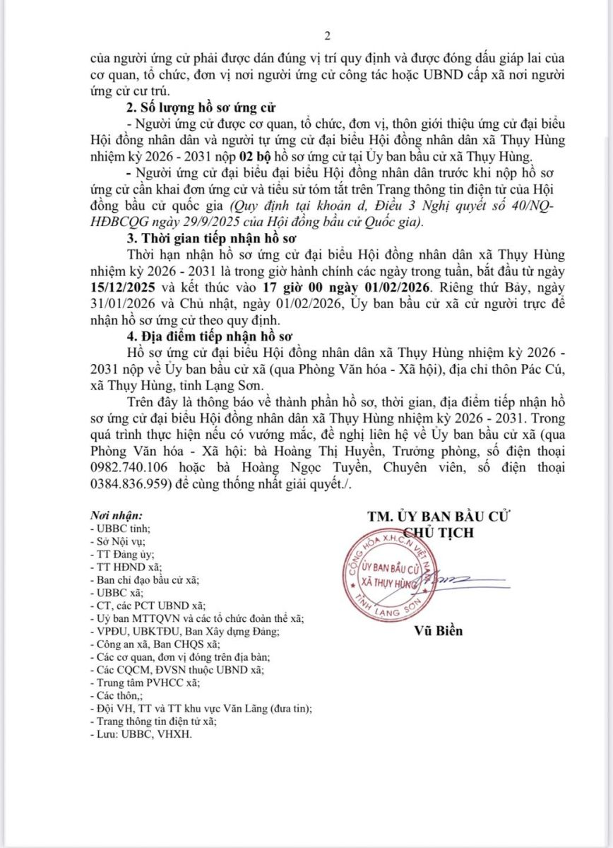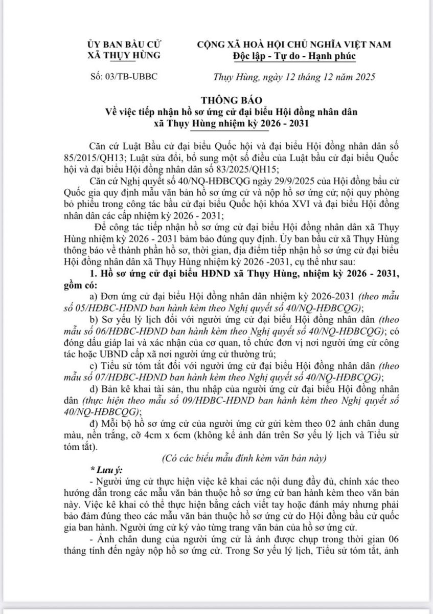 UBND xã Thuỵ Hùng thông báo về thời gian tiếp nhận hồ sơ ứng cử đại biểu Hội đồng nhân dân xã nhiệm kỳ 2026-2031