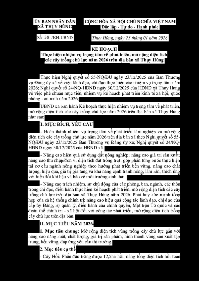 | Tiêu đề văn bản | Kế hoạch Phát triển lâm nghiệp và các cây trồng chủ lực trên địa bàn xã Thụy Hùng năm 2026 | ||