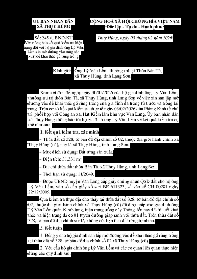 | Tiêu đề văn bản | V/v thông báo kết quả kiểm tra hiện trạng đối với hộ gia ông Lý Văn Lềm xin mở đường vào rừng sản xuất để khai thác gỗ rừng trồng | ||