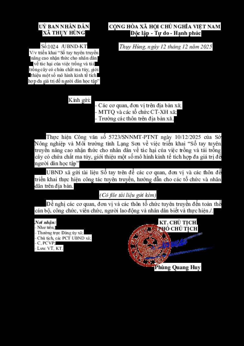 | Tiêu đề văn bản | V/v triển khai "Sổ tay tuyên truyền nâng cao nhận thức cho nhân dân về tác hại của việc trồng và tái trồng cây có chứa chất ma túy, giới thiệu một số mô hình kinh tế tích hợp đa giá trị để người dân học tập" | ||